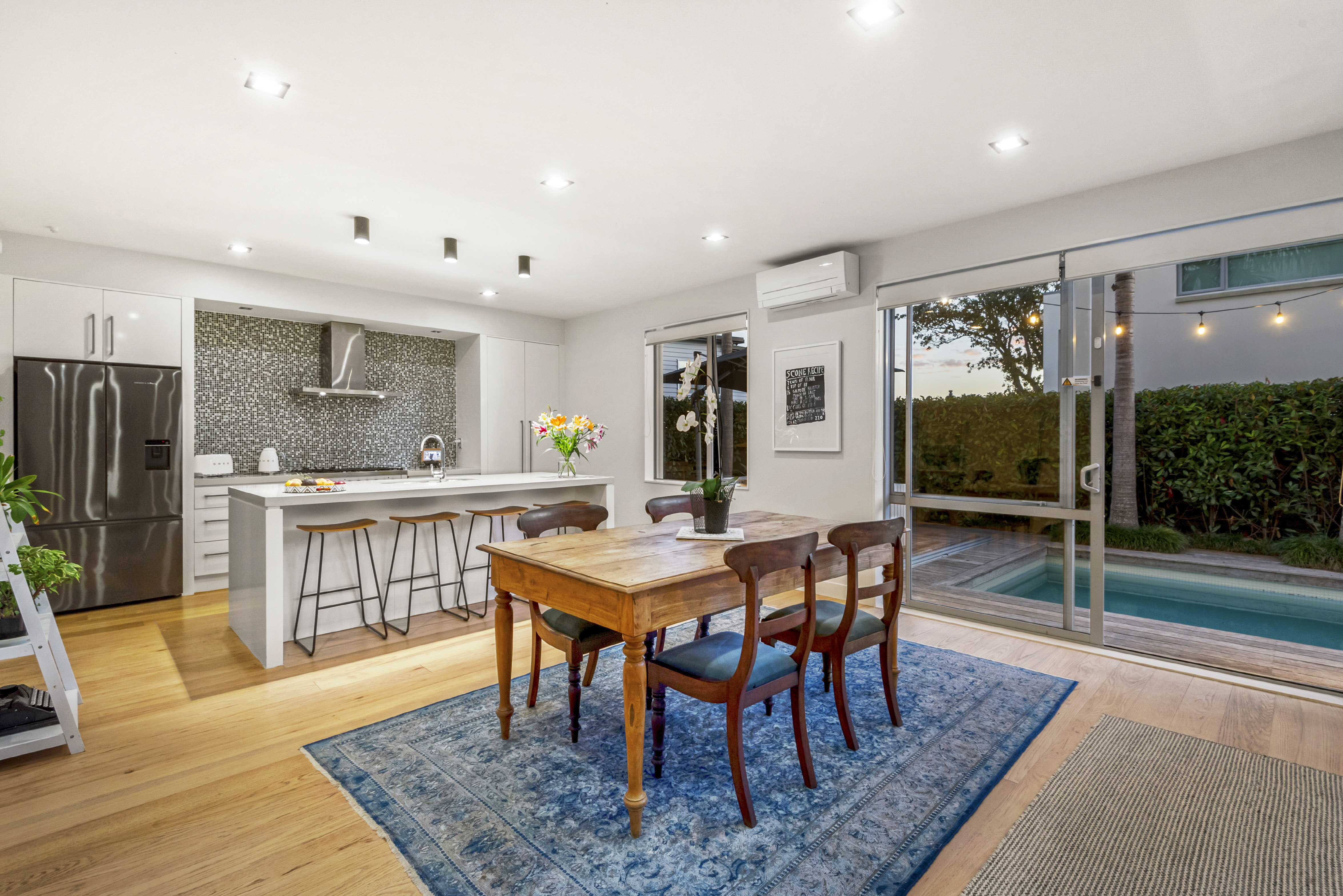The property enjoys an excellent sense of privacy, with the front entrance tucked securely behind a gate. Bathed in northerly sun, the private patio is framed by tropical landscaping that's beautifully illuminated at night, with a spa discreetly positioned around the corner. Inside, the wide entry hall features gallery-style wall spaces anchored by dark American Oak floors. The separate lounge features a gas fireplace for cosy winter evenings, with double doors opening into the expansive living, dining and chef's kitchen area that flows seamlessly to the poolside. The kitchen is well-equipped with quality appliances and a generous butler's pantry.